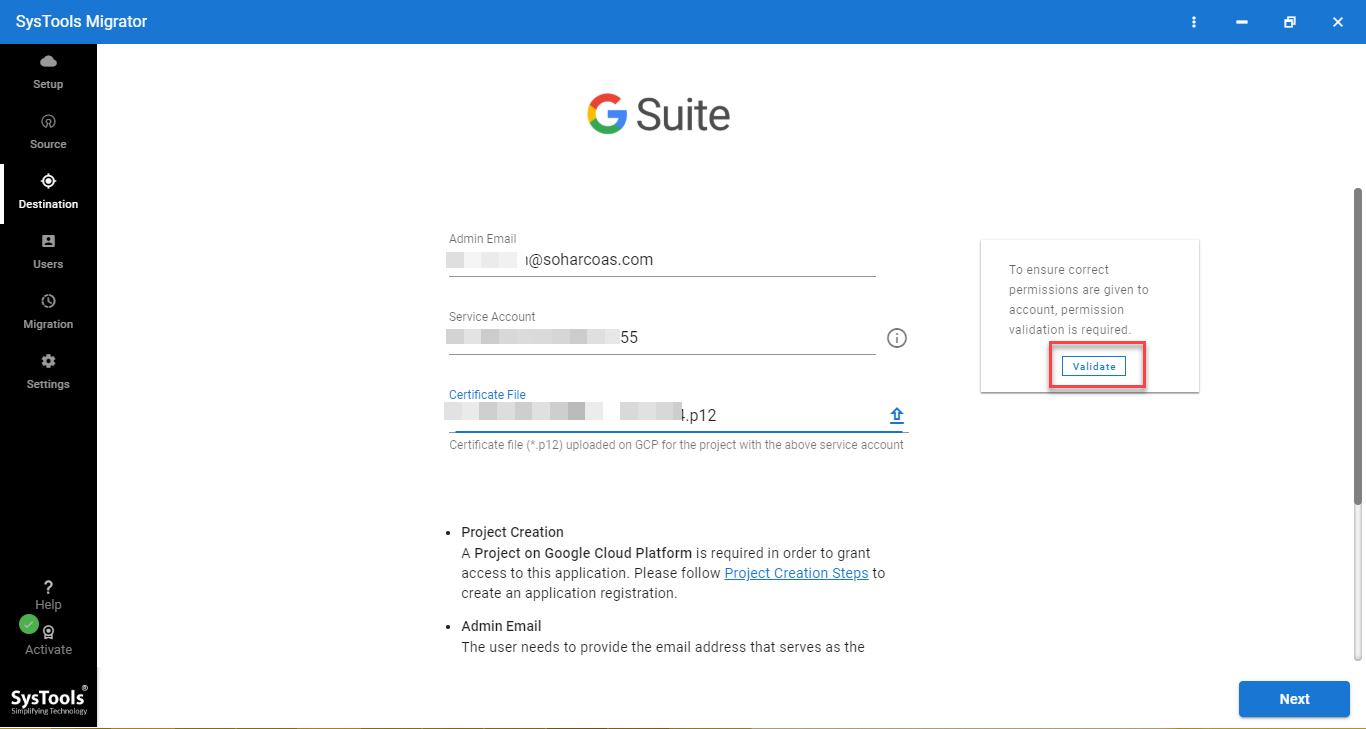 - Enter the G Suite admin credentials & click on validate